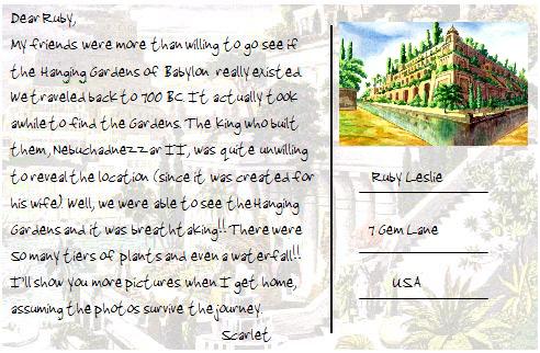 My friends were more than willing to go see if the Hanging Gardens of Babylon really existed we traveled back to 700 BC .It actually took awhile to find the Gardens. The king who built them, Nebuchadnezzer II, was quite unwilling to reveal the location (since it was created for his wife). Well, we were able to see the Hanging Gardens and it was breathe taking!! There were so many tiers of plants and even a waterfall! I'll show you more pictures when I get home, assuming the photos survive the journey.